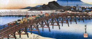 東海道五十三次の「岡崎」、矢矧之橋を渡る大名行列を描いたもの。