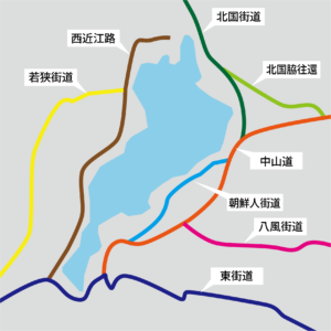 琵琶湖は、奈良時代から近江と呼ばれていた場所にあります。ここにはたくさんの街道が集まっています。