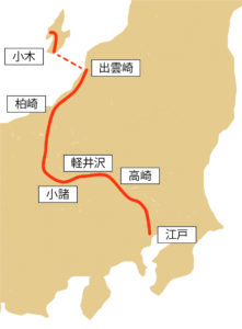 金銀は「御金荷」と呼ばれ、出雲崎から追分(軽井沢)まで北国街道で運び、そこから先は中山道を使って江戸まで運びました。