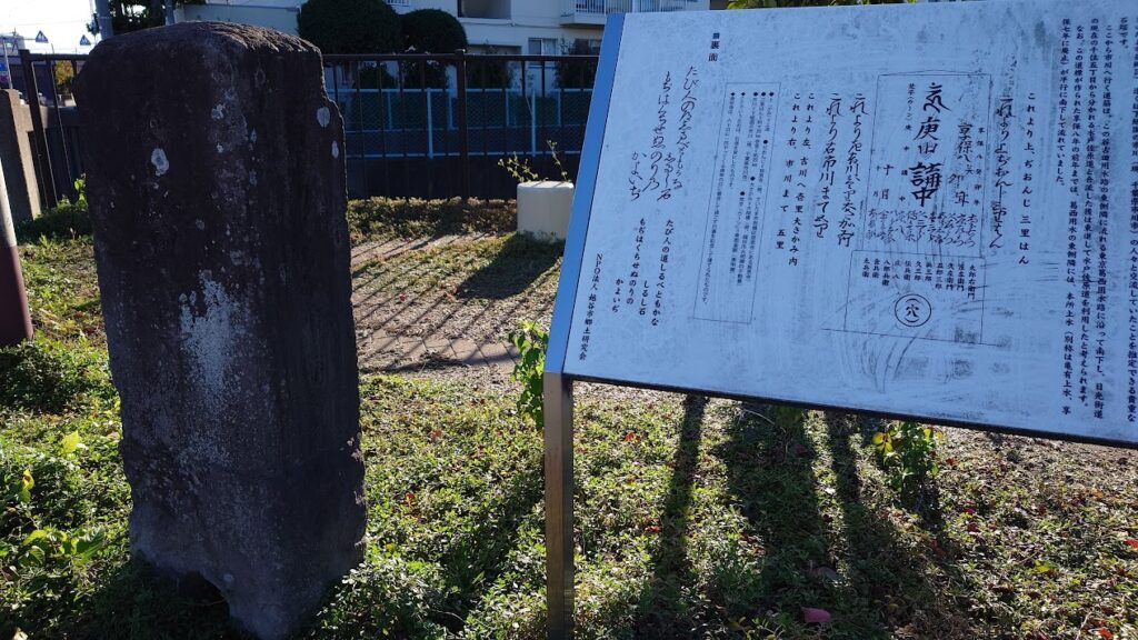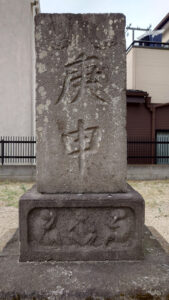庚申塔と道標がひとつになった石塔です。正面に「庚申」と書かれ、側面には「これより右、市川まで五里 これより左、吉川へ一里」と書かれています。