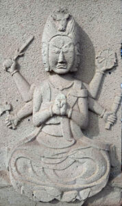 左側が青面金剛で、右側が馬頭観音。青面金剛は顔が三つあり、馬頭観音は頭の上に馬をのせています。