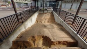 この武蔵国分寺のすぐ近くで、幅12メートルの古代道路が490メートルにわたって発掘されました。奈良時代に整備された七道のひとつである東山道の跡です。この古代道路を真っすぐに伸ばすと、最初の武蔵国分寺があった場所を通っています。