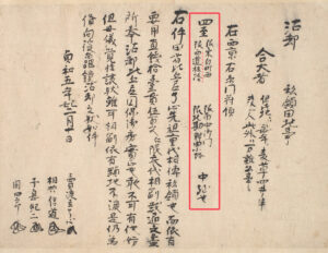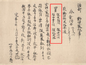 四至には北が「大路」を境としていることが記されています。大きな道に接している土地だから、間口が二間しかないのに価格が米十石と高価です。
