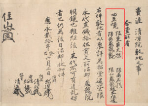 清涼院の敷地を売却するときにその範囲が記されています。四至には、東側を車大路で限ると書いてあるので、牛車が通行できる幅広い道が境界になっていました。ここでも道が境界として利用されています。道が土地所有の境界になっているのはいまでも同じですね。