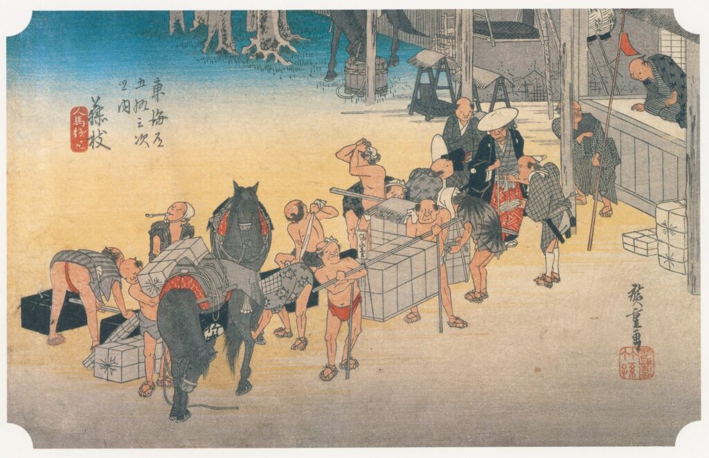最近ではトラック運転手の働き方改革で、長い距離をひとりの運転手が運ぶのではなく途中で積み荷や運転手を交換する中継輸送方式が注目されています。江戸時代の輸送方法に似ていますね。